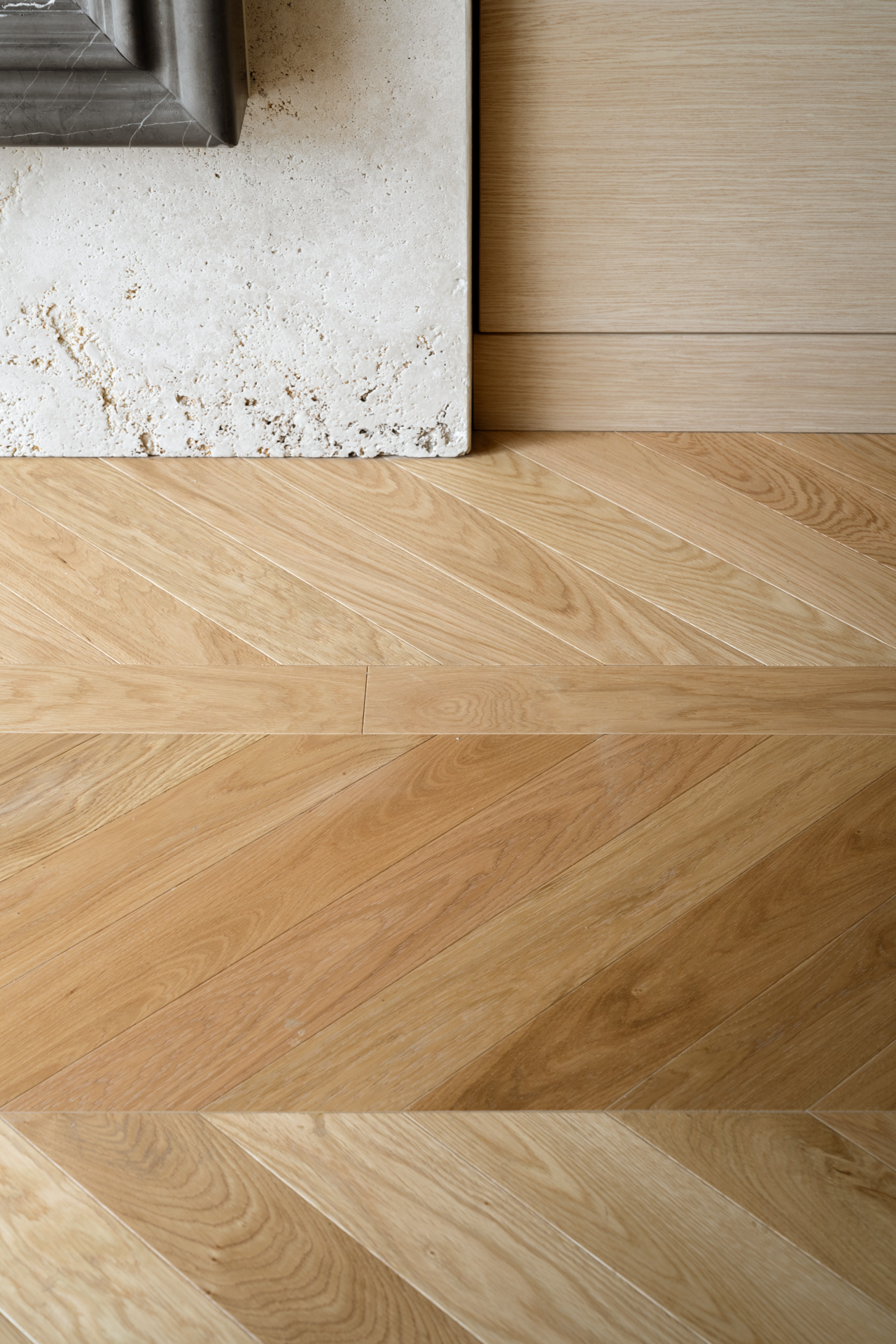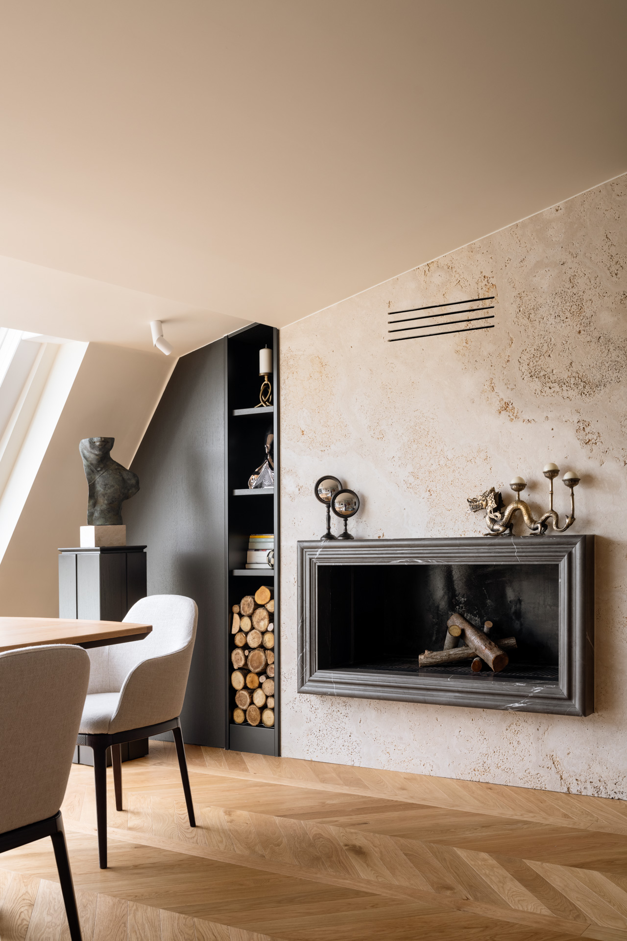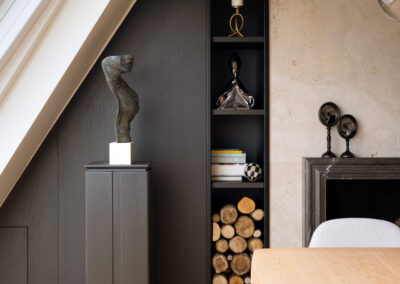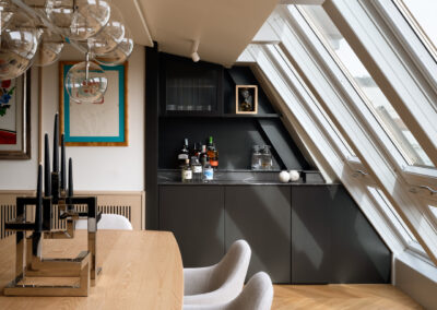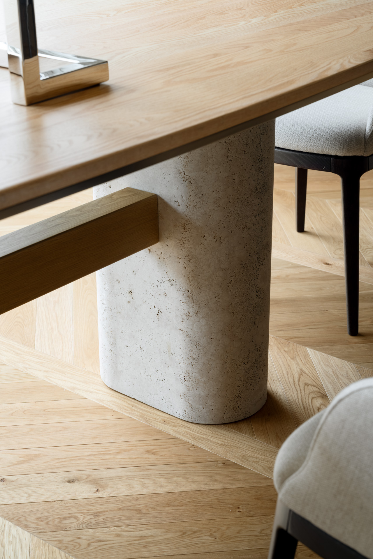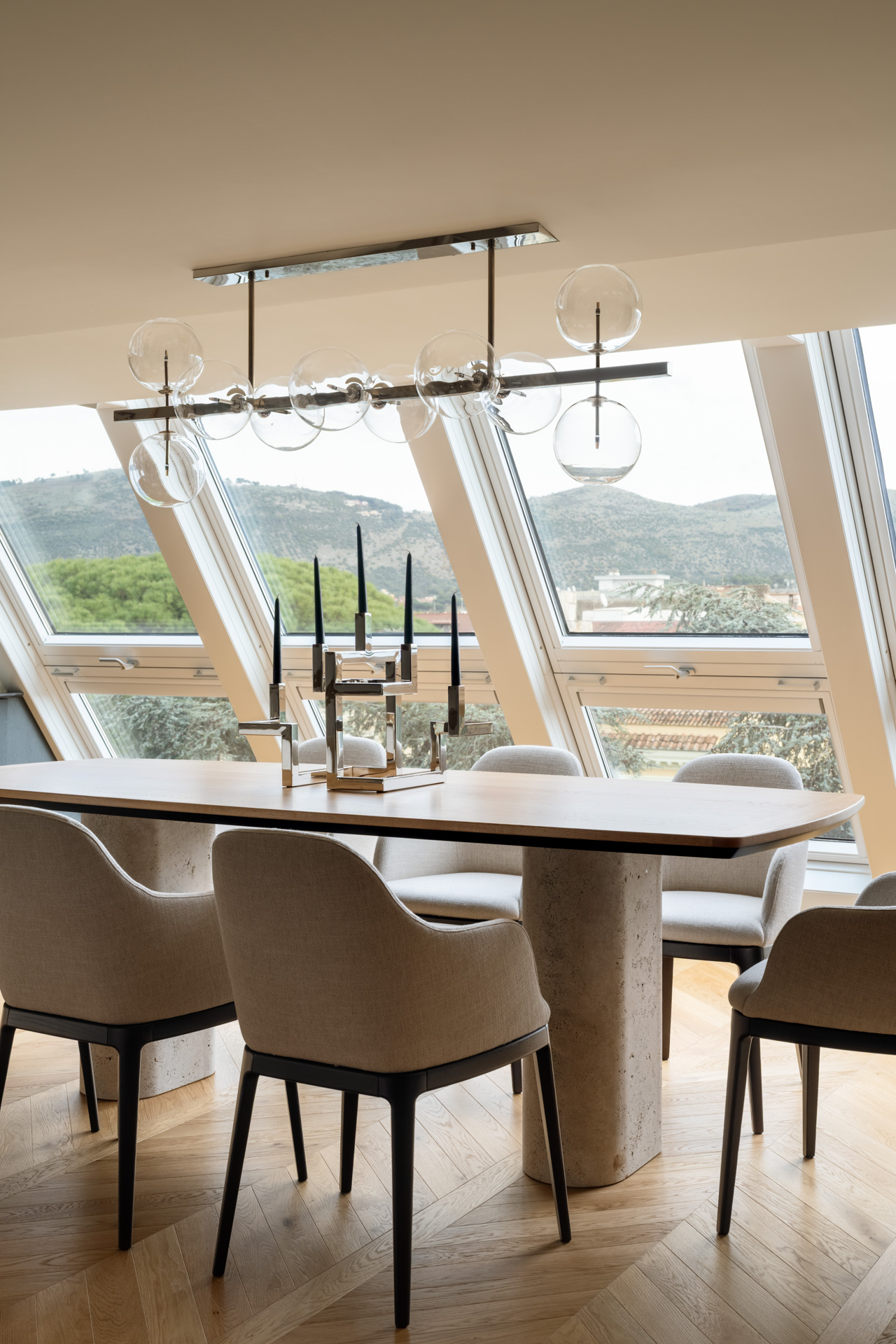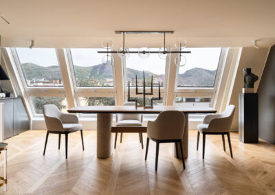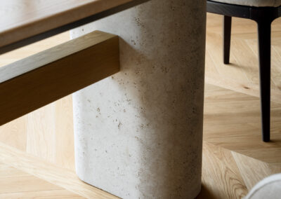 Al centro della scena, il tavolo su misura si impone con le sue imponenti basi cilindriche in travertino grezzo. La porosità naturale della pietra contrasta con la levigatezza del piano in legno e la struttura metallica del lampadario a sfere di vetro. Un pouf capitonné in velluto ottanio introduce infine una nota cromatica decisa, completando un ambiente dove ogni dettaglio è pensato per un’esperienza spaziale ariosa, colta e senza tempo.