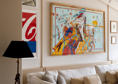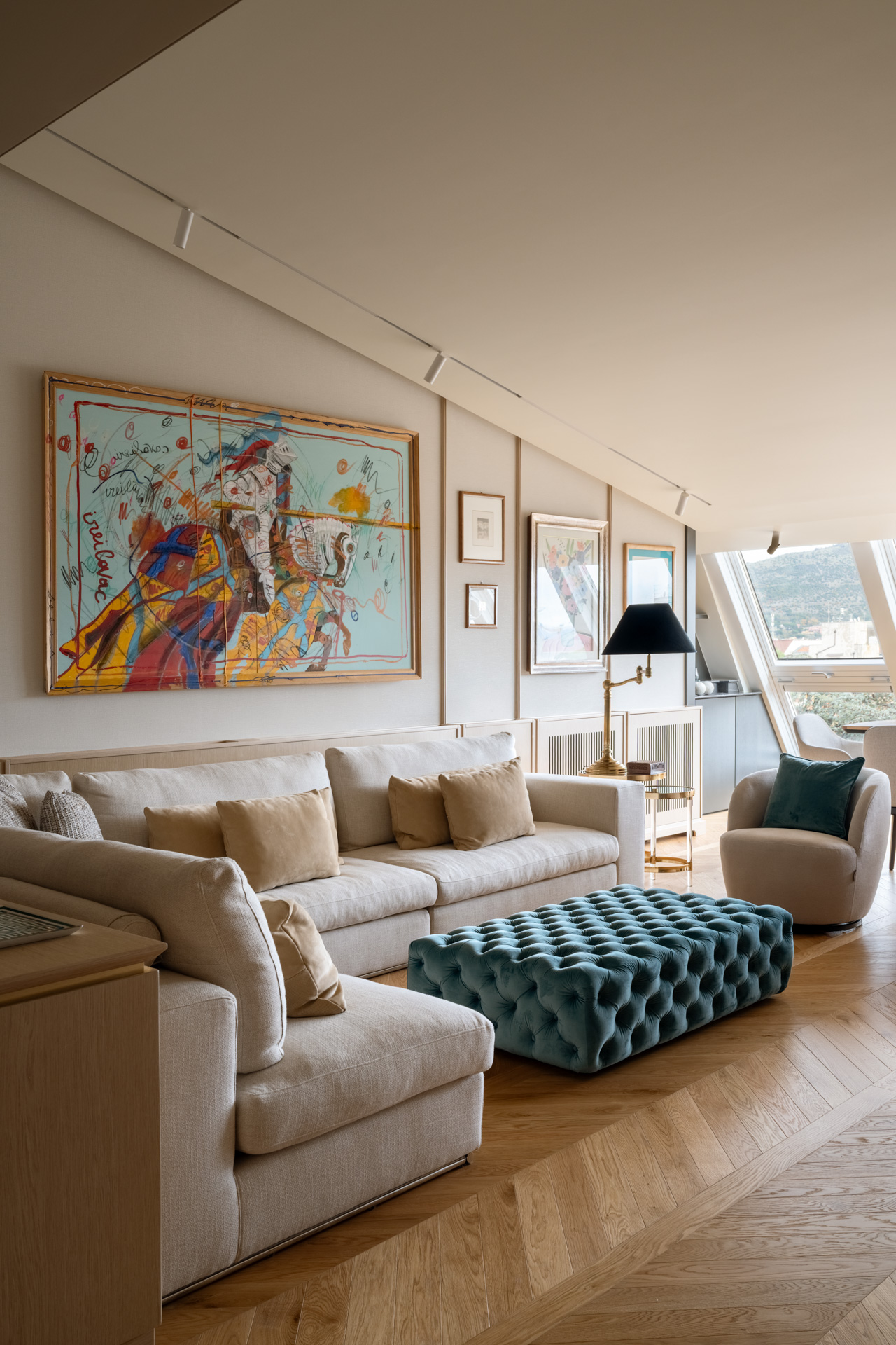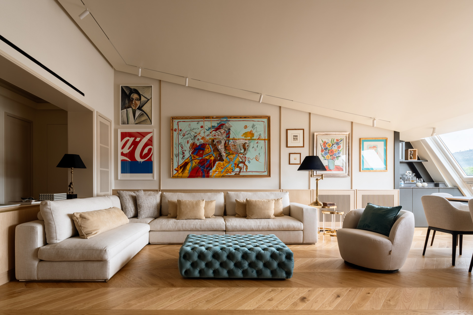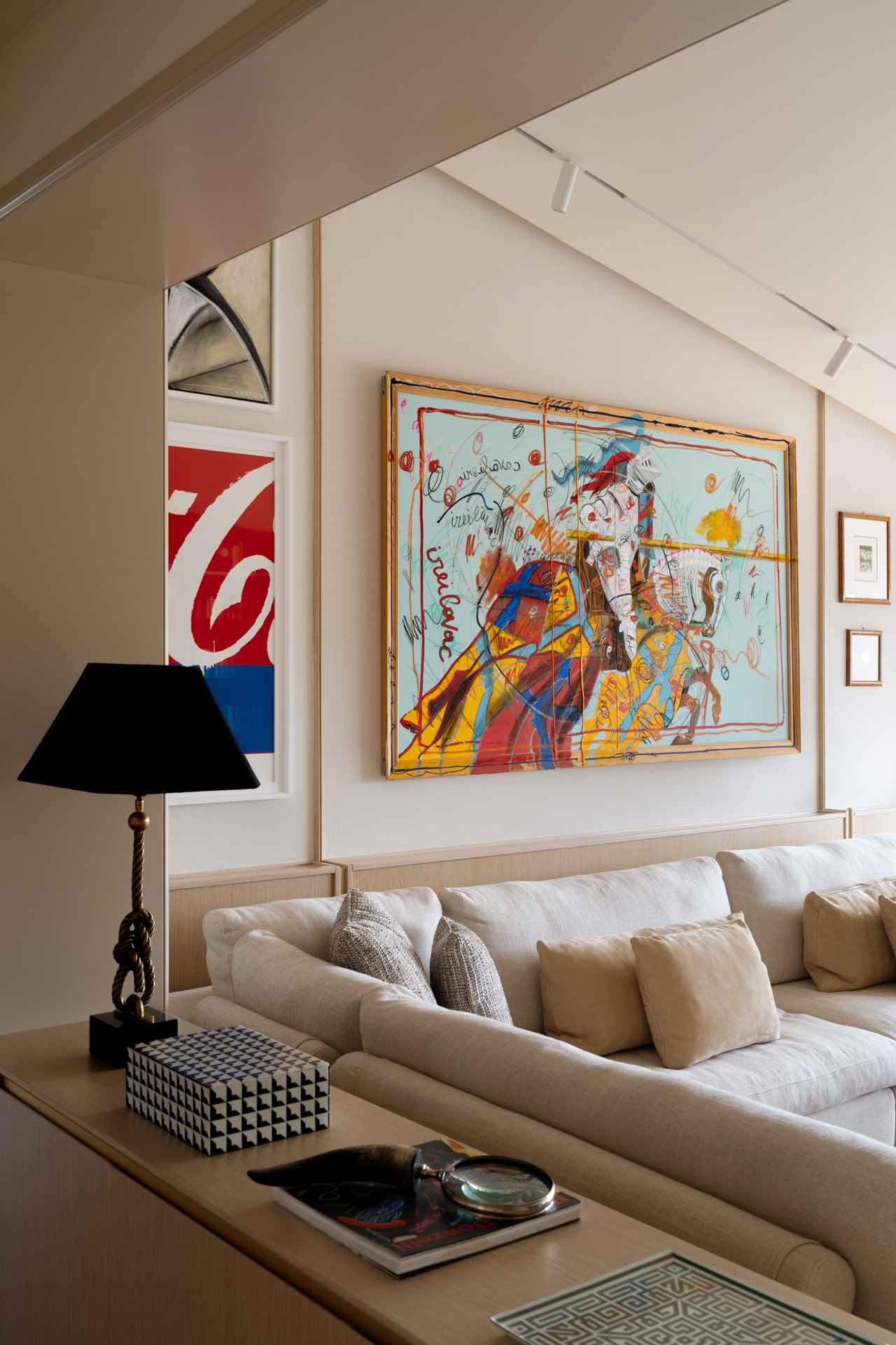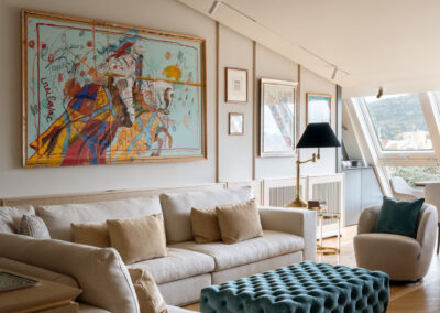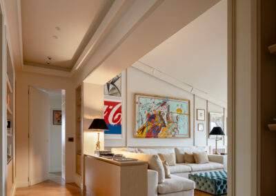 L’area relax è definita da una boiserie in legno chiaro che corre lungo tutto il perimetro, garantendo continuità visiva dall’ingresso fino al cuore del soggiorno. La parete si trasforma in una galleria privata. Sottili profili verticali in legno riproporzionano le altezze e incorniciano una collezione di opere d’arte contemporanea. Le tele, caratterizzate da una gestualità cromatica vibrante, diventano i punti focali dello spazio, dialogando con la luce naturale che spiove dalle finestre in falda.