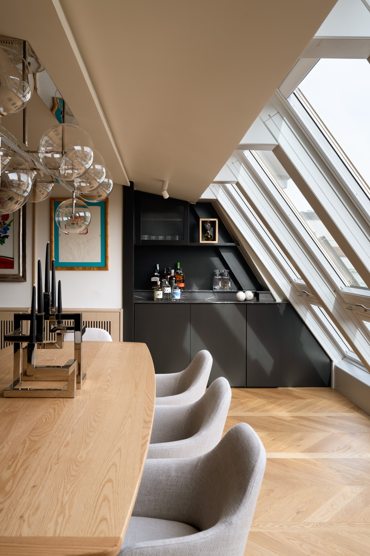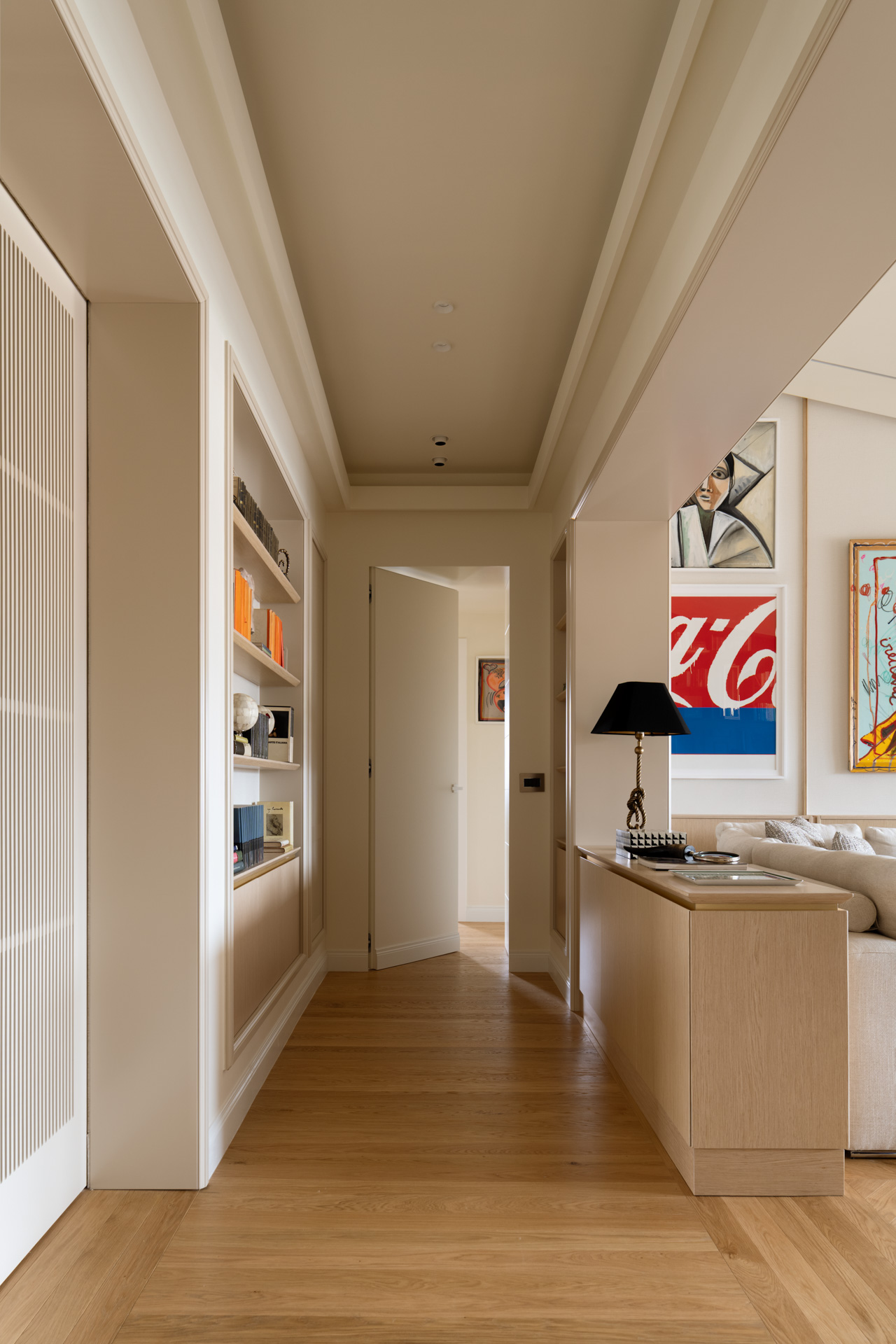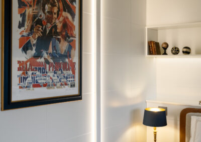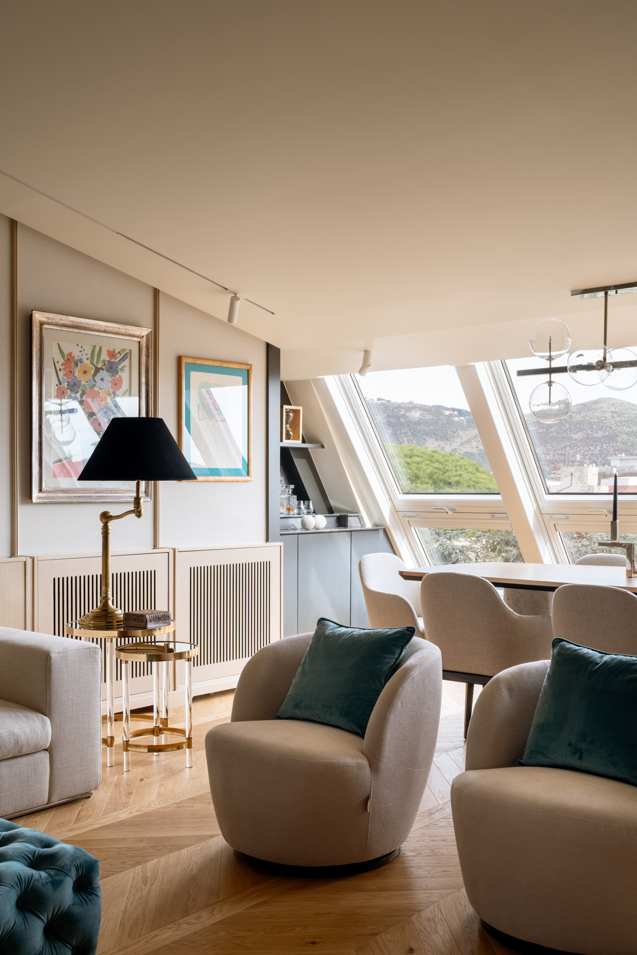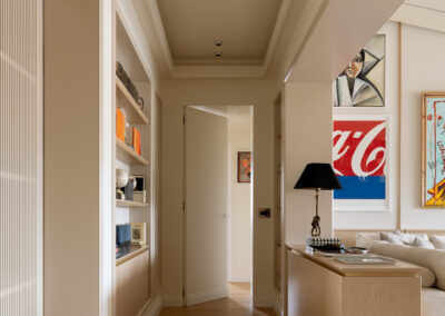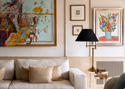 L’area relax è definita da una boiserie in legno chiaro che corre lungo tutto il perimetro, garantendo continuità visiva dall’ingresso fino al cuore del soggiorno. La parete si trasforma in una galleria privata. Sottili profili verticali in legno riproporzionano le altezze e incorniciano una collezione di opere d’arte contemporanea. Le tele, caratterizzate da una gestualità cromatica vibrante, diventano i punti focali dello spazio, dialogando con la luce naturale che spiove dalle finestre in falda.