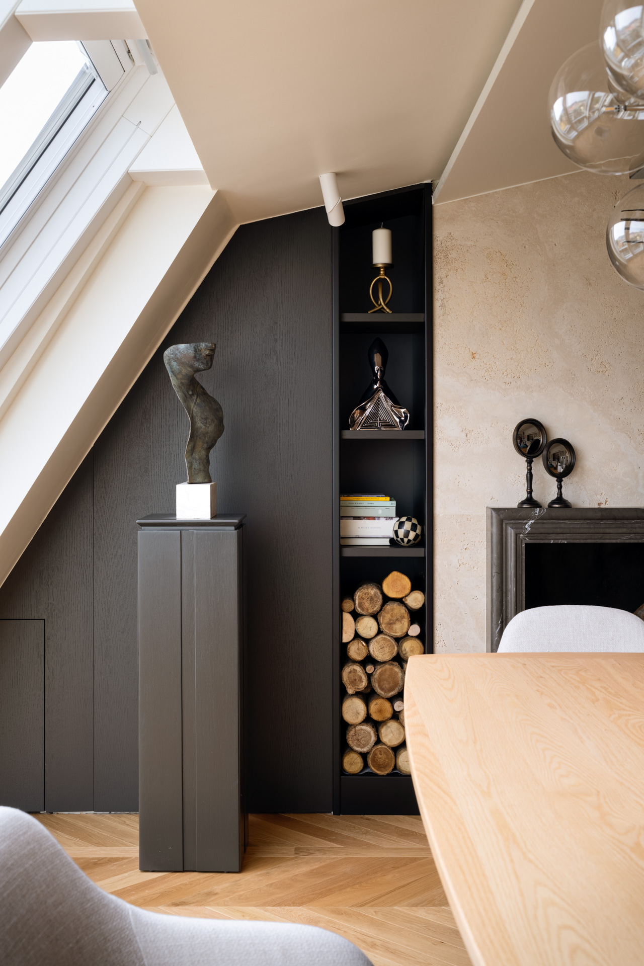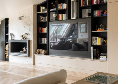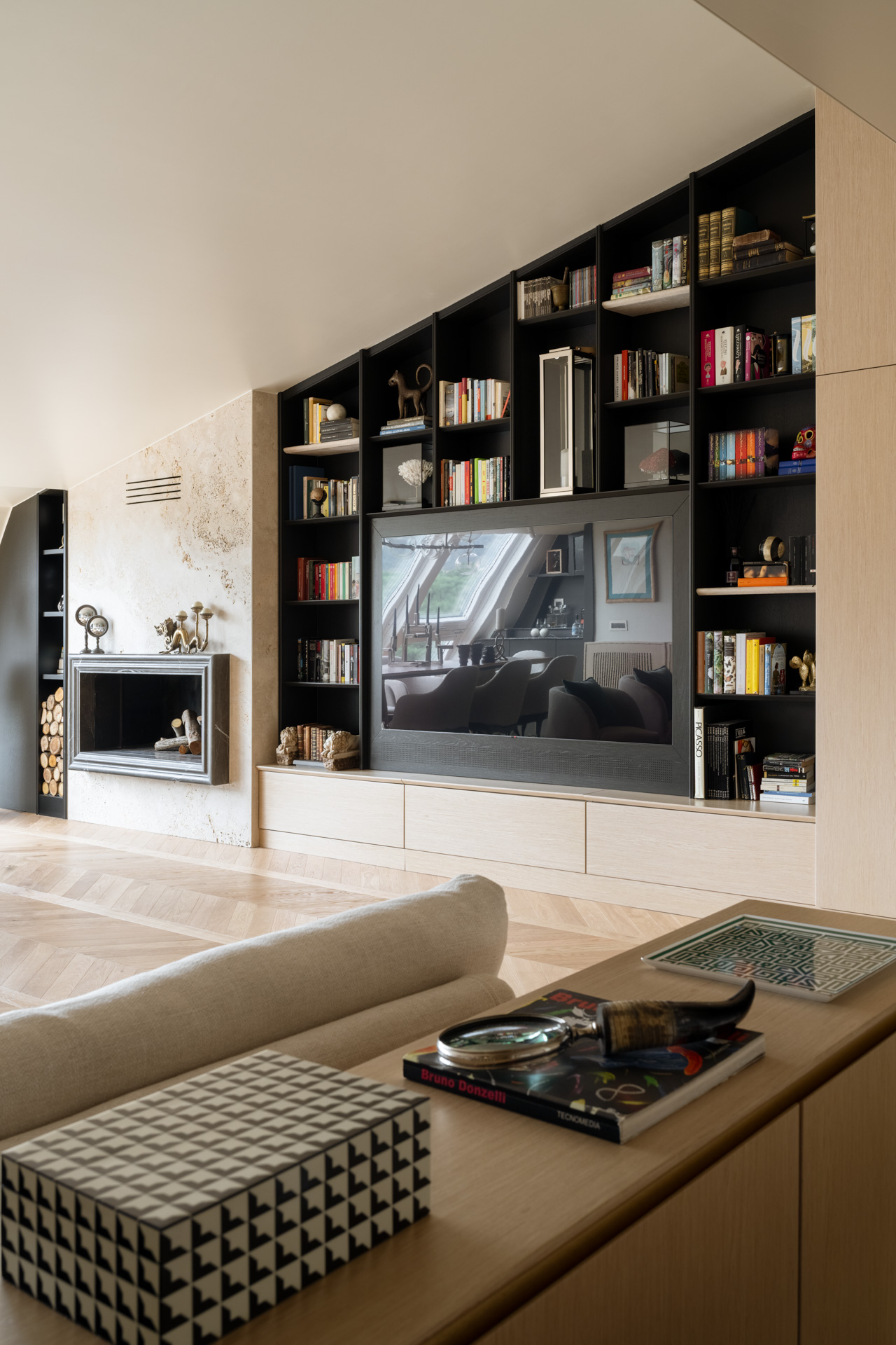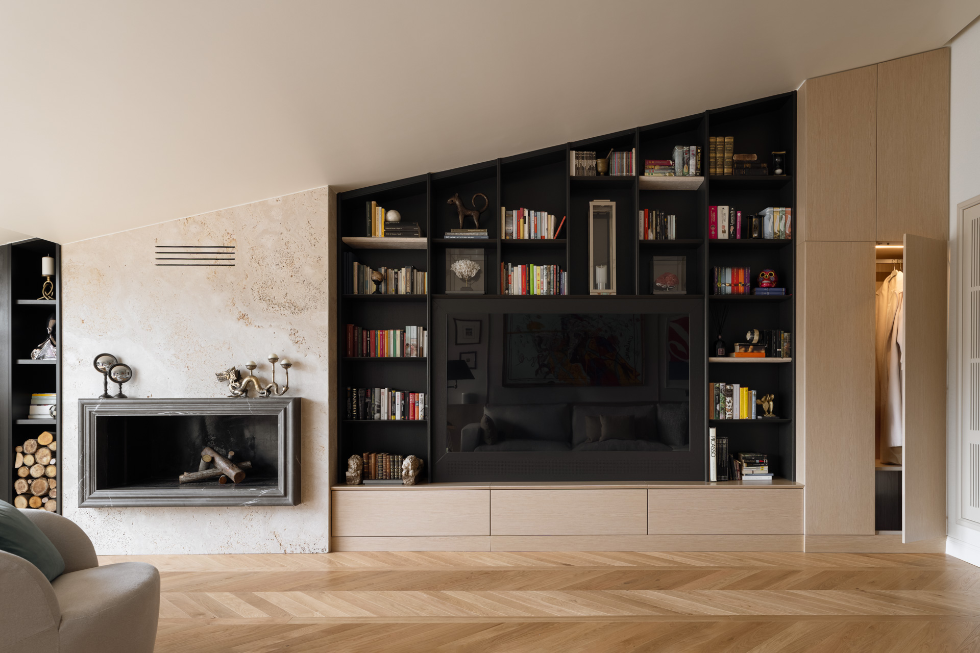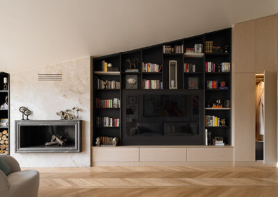 La parete frontale al divano è definita da un imponente sistema di falegnameria su misura in legno chiaro, progettato per dialogare con l’andamento diagonale della copertura. Questa struttura non è un semplice arredo, ma un elemento architettonico multifunzionale: nella parte più alta ospita una libreria a giorno con montanti neri che ritmano la successione di volumi, mentre i vani inferiori integrano con discrezione una cappottiera e spazi di stivaggio tecnico. Al centro, la composizione si svuota per accogliere il televisore, incorniciato in un modulo che sembra scomparire nella struttura, mantenendo pulita la linea visiva dell’intero ambiente.