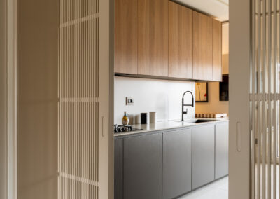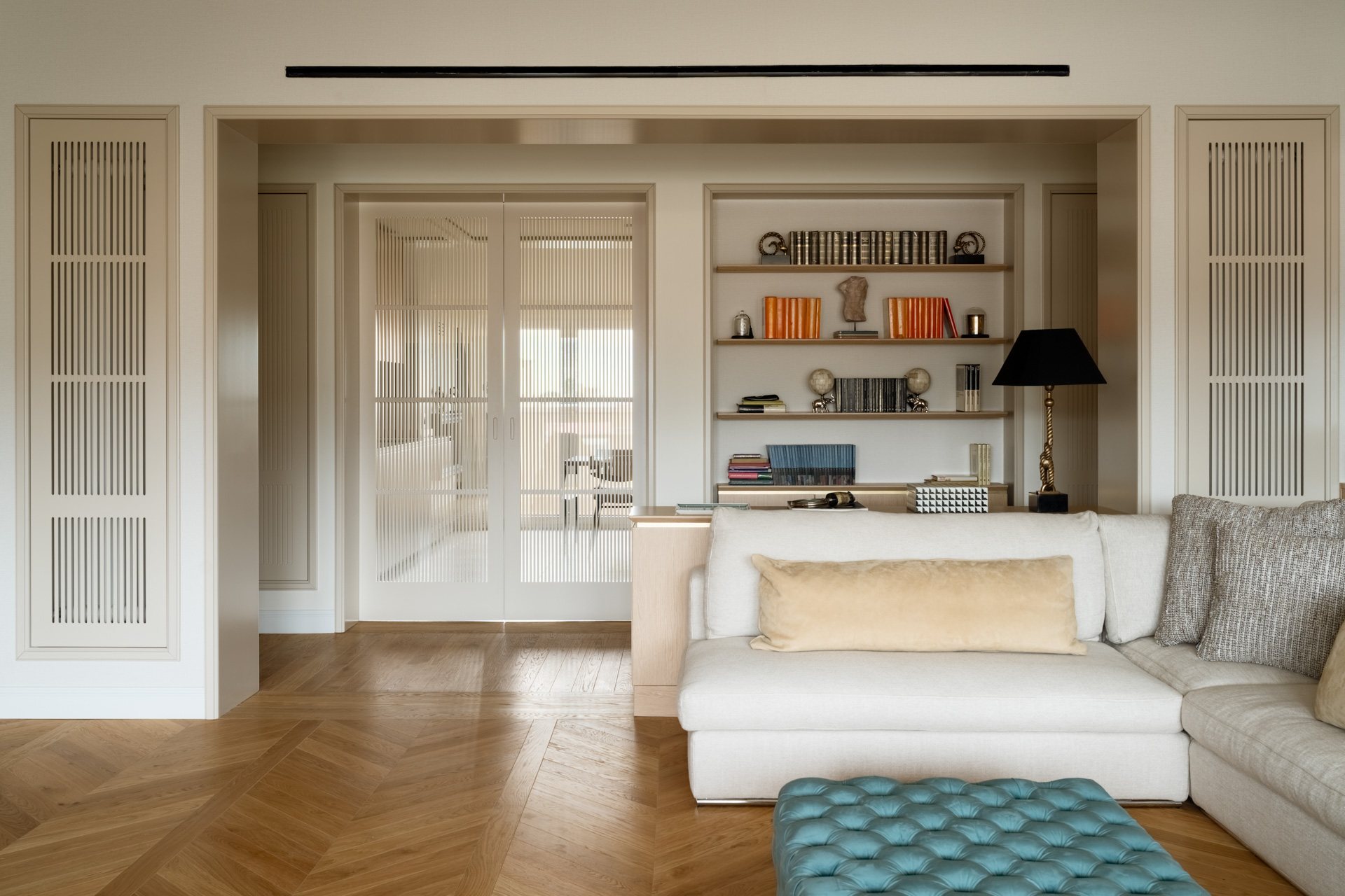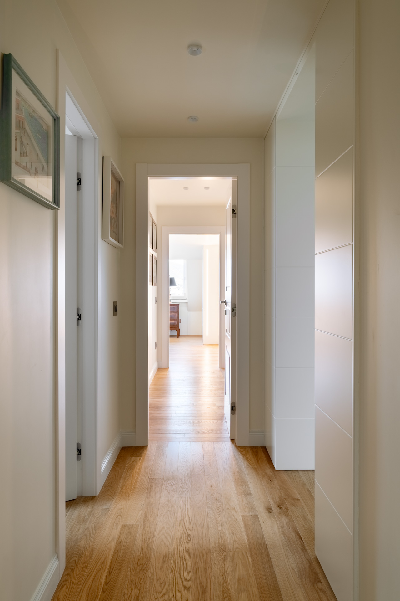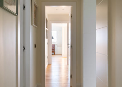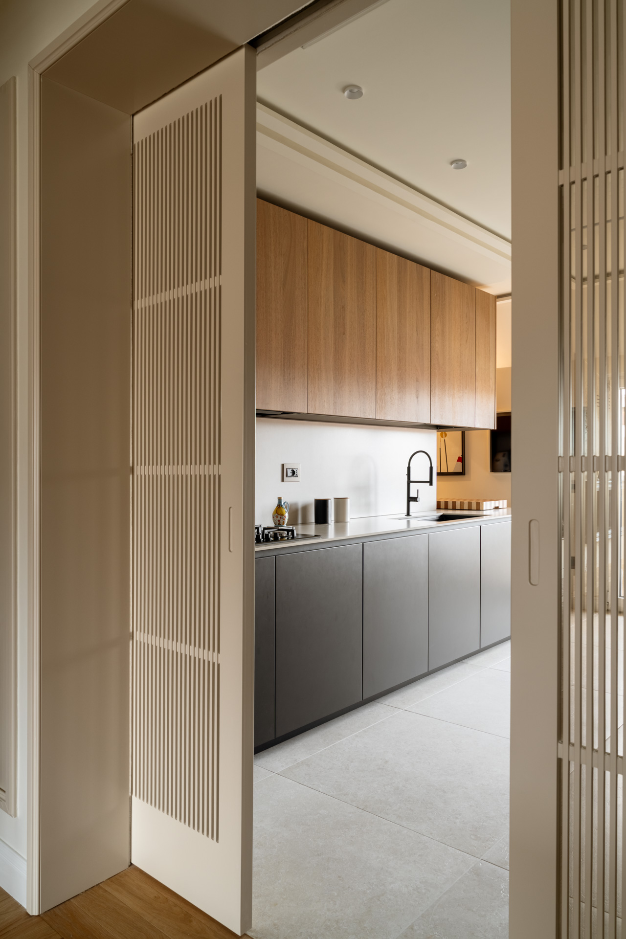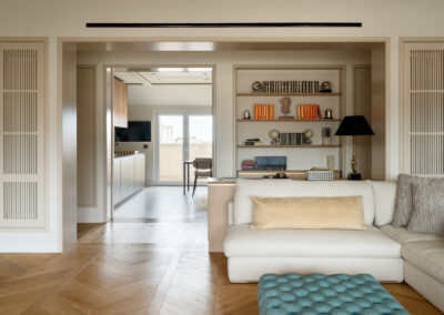 Un raffinato sistema di portali in falegnameria scandisce il passaggio tra le diverse zone della casa. La geometria rigorosa dei portali incornicia gli ambienti interni, creando una successione di quinte visive. All’interno dello spessore dei portali trovano posto librerie a giorno e vani contenitivi, ottimizzando ogni centimetro della pianta senza appesantire il disegno d’insieme.