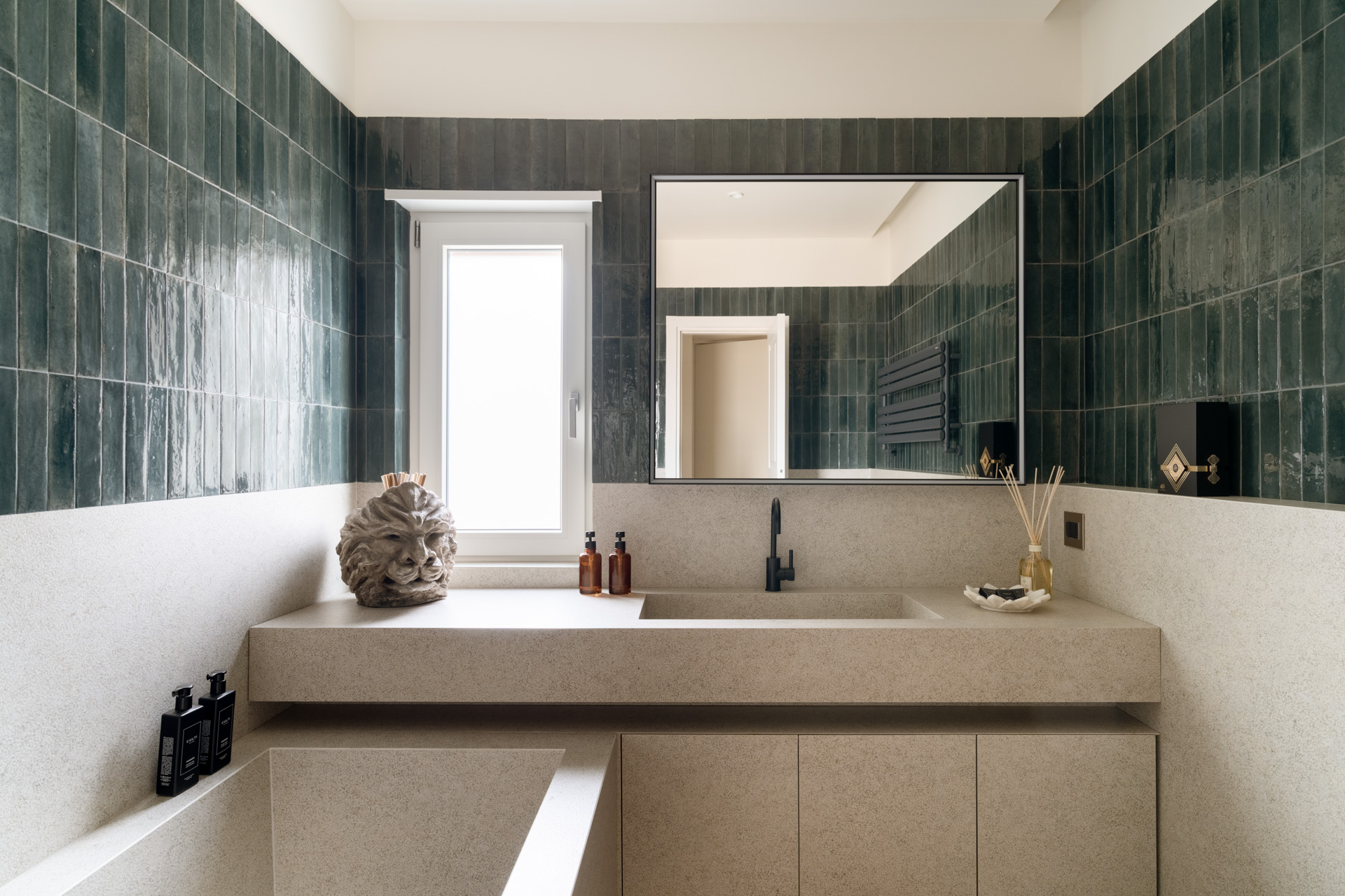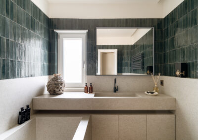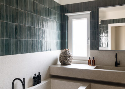 In perfetta sintonia con il linguaggio materico dell’intera abitazione, il bagno si presenta come un volume architettonico dove la pietra e la ceramica definiscono uno spazio dal rigore quasi scultoreo. La zona lavabo e la vasca sono integrate in un unico sistema in pietra grigia dalla texture puntinata, che richiama la solidità degli elementi strutturali del living. La rubinetteria nera opaca aggiunge un tocco di modernità grafica, mentre il lampadario in cristallo a corona e la scultura decorativa a forma di testa di leone nobilitano l’ambiente, trasformandolo in una vera e propria sala da bagno dal carattere sofisticato.