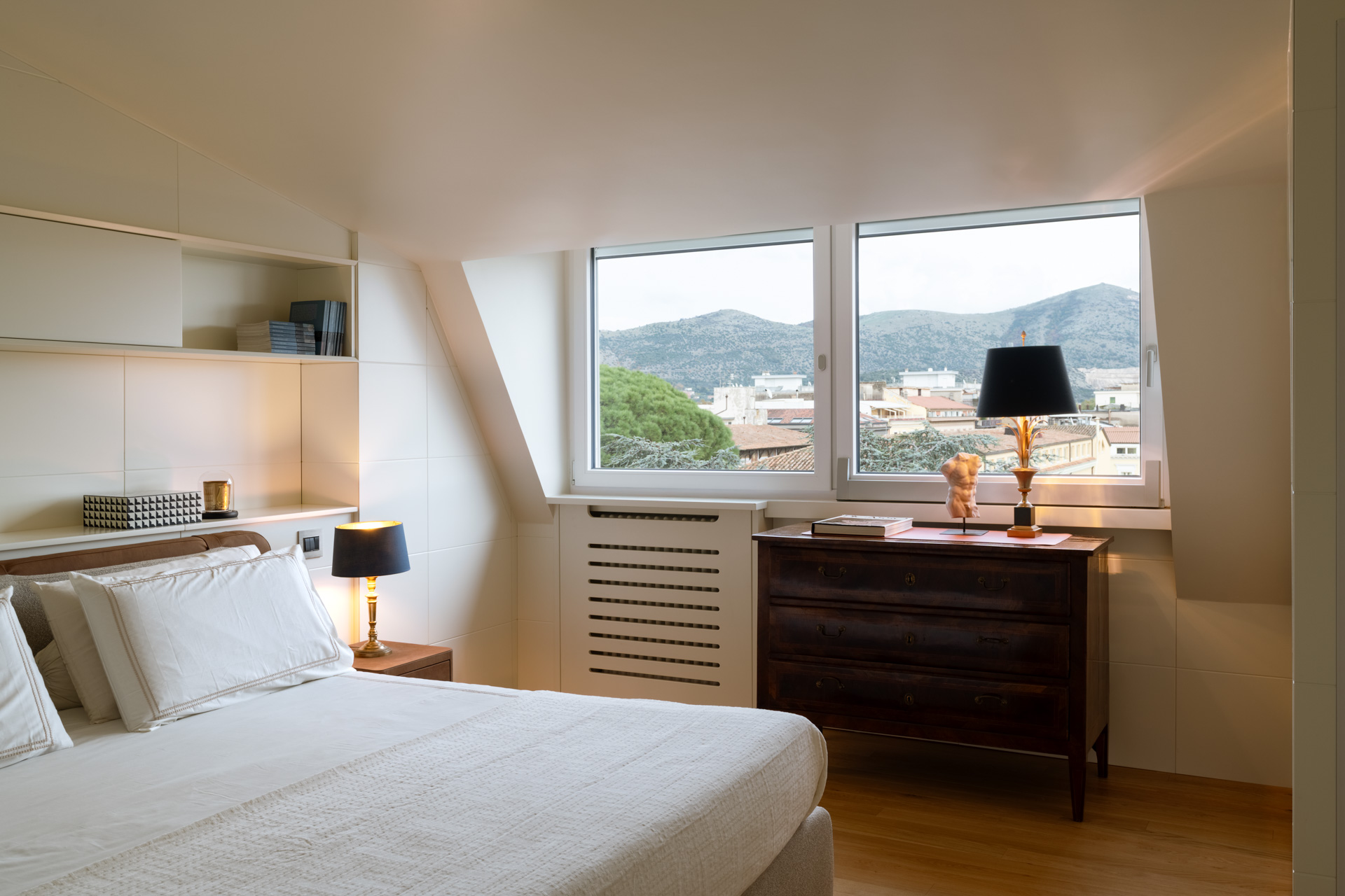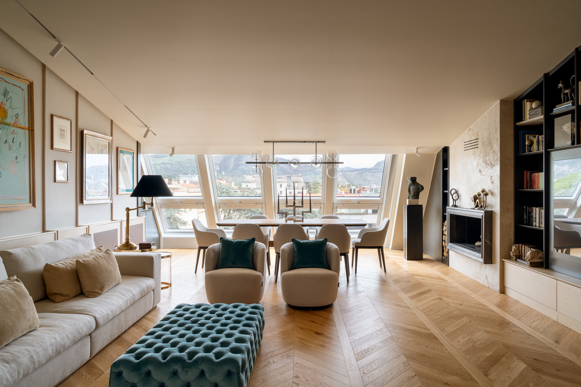L’elemento architettonico di rottura è indubbiamente la grande parete vetrata inclinata, che segue la linea della falda. Questa scelta non solo inonda l’ambiente di luce naturale zenitale, ma agisce come un cannocchiale visivo che integra lo skyline casertano e il profilo delle colline circostanti nel living. I serramenti bianchi ritmano lo spazio, creando un gioco di luci e ombre che si proietta sul pavimento in rovere posato a spina d’ungherese, vero connettore materico di tutta l’abitazione.